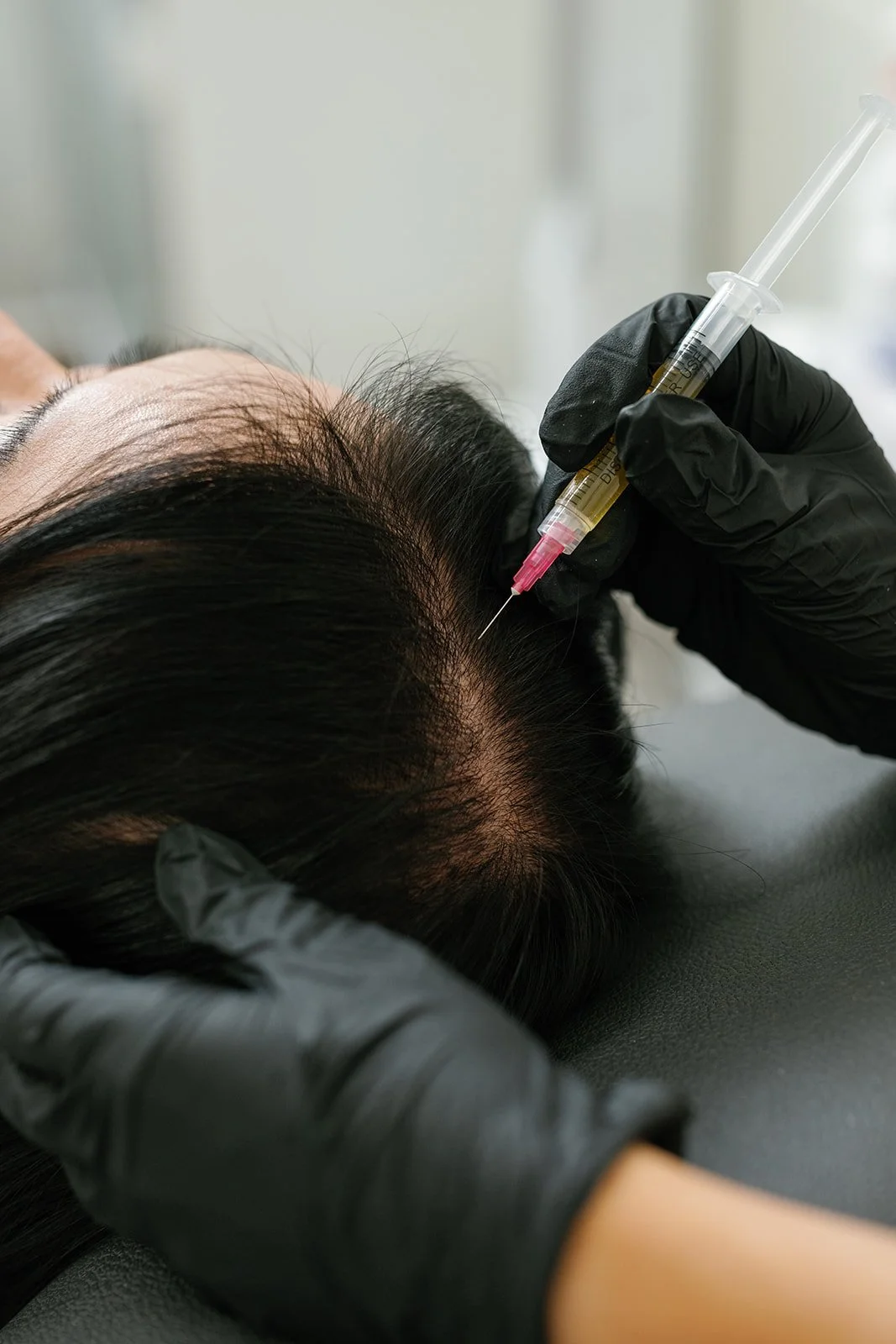 The concentrated PRP, rich in growth factors, is then injected into areas of the scalp where hair loss is occurring.